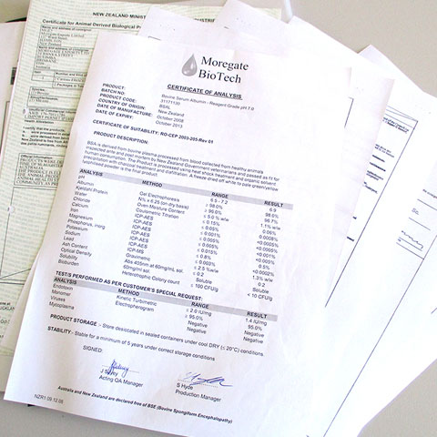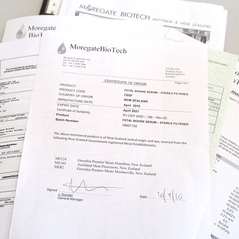Animal Health Certificates issued by the National Veterinary Authorities (MAF New Zealand and DAWR Australia - previously DAFF) attesting to the origin and health of the animals which the product was derived from are included with all export shipments from Australia or New Zealand. These Animal Health Certificates are prepared according to a format and content that is agreed to by the issuing authority and the competent authorities of the country of destination.